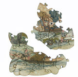 The puzzle has irregular curvy piece shapes, lots of themed whimsies and large multi-piece whimsies, and a lazy hand-drawn irregular edge that makes it hard to tell which pieces are the edge pieces. Puzzle design by Marcelle Jay Iremedio.