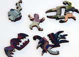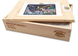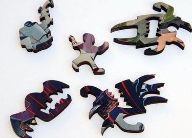 The image of this 268 piece wooden jigsaw puzzle shows playfully-monstrous forces of evil stampeding onto the green pastures of scared circus bunnies, brain-trees, and cartoonish mountain goats. Like our other puzzle by LA artist Joe Vaux (Fishing Village), this puzzle has puzzle pieces designed especially for this puzzle by Joe Vaux (to see example puzzle pieces for this puzzle, click the small picture under the big picture above). This puzzle has a straight edge and average difficulty. Some may recognize Joe Vaux's style from his work as an illustrator for the show "Family Guy." All our puzzles are made of 1/4" thick real wood in the USA. This puzzle is packaged in a pine wood box.