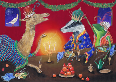 In British painter E.C Woodard's signature style, the fun for all-ages artwork shows the three kings that visited Jesus bearing gifts, depicted as animals celebrating with a feast.