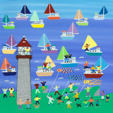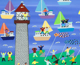 This is a 242 piece wooden jigsaw puzzle of the folk art piece "Seaside" by British artist Gordon Barker. This puzzle is easy: the puzzle design by David Figueiras has simple square-ish pieces, many beach and ocean whimsies, a straight edge and varied connectors.
