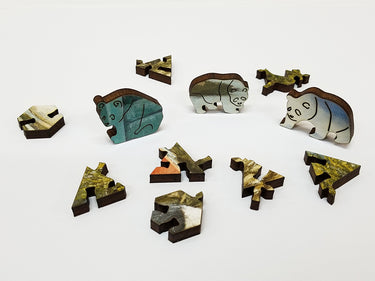 This is a 224 piece wooden jigsaw puzzle featuring Tyson Grumm's work Slacking Pandas. Designed by Tara Flannery, this puzzle features bamboo-shaped connectors, themed whimsy pieces, and a straight edge. These pandas really know how to slack after a day full of chomping on bamboo--the only thing that would make it better would be relaxing with this charming puzzle! This puzzle also takes it easy in its difficulty rating.