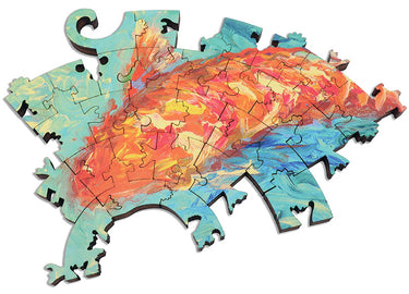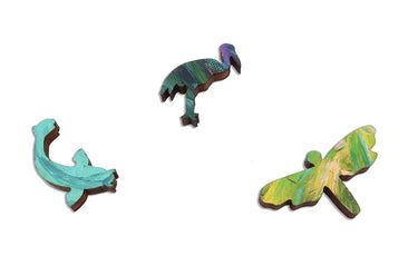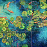 This gorgeous koi pond wooden jigsaw puzzle has 2,476 pieces, and features the lush nonatych painting Nueve by contemporary artist Iris Scott.