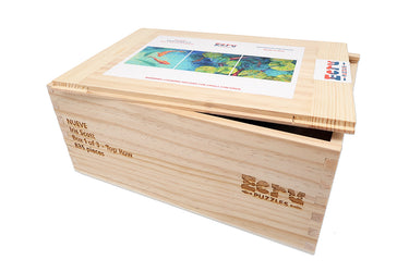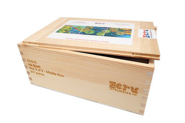 Choose The Easy Or Hard Path: The puzzle will ship in a set of 3 wood boxes. Each box will have the pieces for a row of 3 panels of the 9 panel puzzle. So you can choose the "easy" path of putting it together as series of three 800+ piece puzzles, or you can pour all the pieces out, mix them together, and enjoy an incredible 2,476 piece challenge.