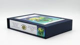 Packaged in a blue box with a small picture of the image on top, and a side label.