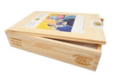 Like all our puzzles, laser-cut from 1/4" thick wood. Packaged in our standard pine wood box. Made in USA.