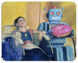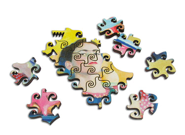 This is a 180 piece wooden jigsaw puzzle showcasing Eric Joyner's "Comrades." Designed by Tara Flannery, this puzzle features larger split tendril connector pieces and super fun large whimsies. Really is there anything better than Frida Kahlo, robots, donuts, and split tendril connectors?