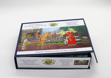 This 80 piece wooden jigsaw puzzles is a great puzzle to do with kids, as it has slightly larger pieces than usual, extra-robust whimsy pieces, and a kid-friendly image of Gerhard Munthe's painting of a princess meeting a knight. Exuberant curvy knob connectors, and a straight edge (puzzle design by Chandler Millwood). Like all our puzzles, this is laser-cut from 1/4" thick wood, and made in USA. Packaged in a small box with a magnetic clasp. Made in USA.