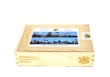 Packaged in our standard pine wood box - it has a small box picture of the long image broken up into two rows. Engraved side label.
