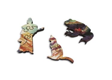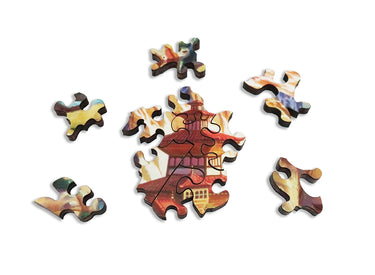 Our 277 piece Dragon Mountain wooden jigsaw puzzle painting is by Washington illustrator Bryn Barnard. This is a great puzzle to put together as a family. It features Asian-themed multi-piece figurative whimsy pieces designed by Seattle graphic artist Jimmy Farmer: find the ninja, dragon, footbridge, kanji, towers, samurai, toad, helmet, and panda (click on the small image below the big image above to see example puzzle pieces). This puzzle has a straight edge and average difficulty. All our puzzles are made of 1/4" wood. Comes packaged in an unfinished pine wooden box. Warning: puzzle pieces can be a choking hazard for small children.