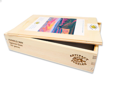 This 317 piece wooden jigsaw puzzle is a 1912 painting by British painter Spencer Gore, of The Icknield Way, an ancient road in England that runs from Norfolk to Wiltshire. The puzzle design features whimsies themed to British travelers from ancient times to present, and irregular pentagonal pieces, all designed by puzzle artist Tara Flannery. This puzzle has a straight edge and average difficulty. Like all our puzzles, laser-cut from quarter-inch thick wood. Packaged in a pine wood box with sliding lid. Made in USA.