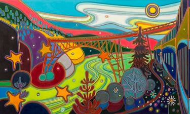 Embark on a transformative journey with Darlene Kulig's signature bold, joyous, and whimsical style as she brings to life her trip on the Rocky Mountaineer across the iconic CNR Cisco Bridge in British Columbia, capturing the majesty of train travel and the breathtaking beauty of the Canadian landscape.