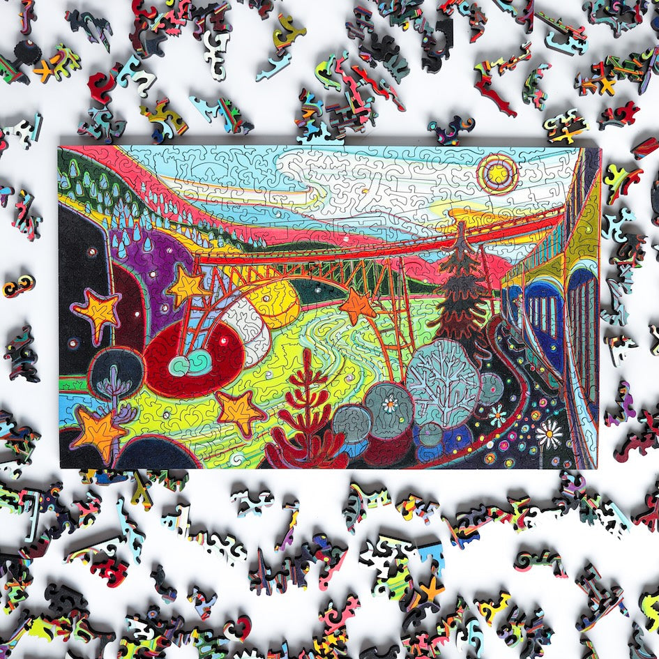 More than just a puzzle, this handcrafted wooden masterpiece invites you to navigate and flow through life's passages. Explore themes of resilience, trust, and shifting perspectives as you piece together Darlene's vibrant vision. Discover a rich tapestry of unique whimsies hidden within the meticulously cut pieces, transforming each solving experience into a delightful scavenger hunt.