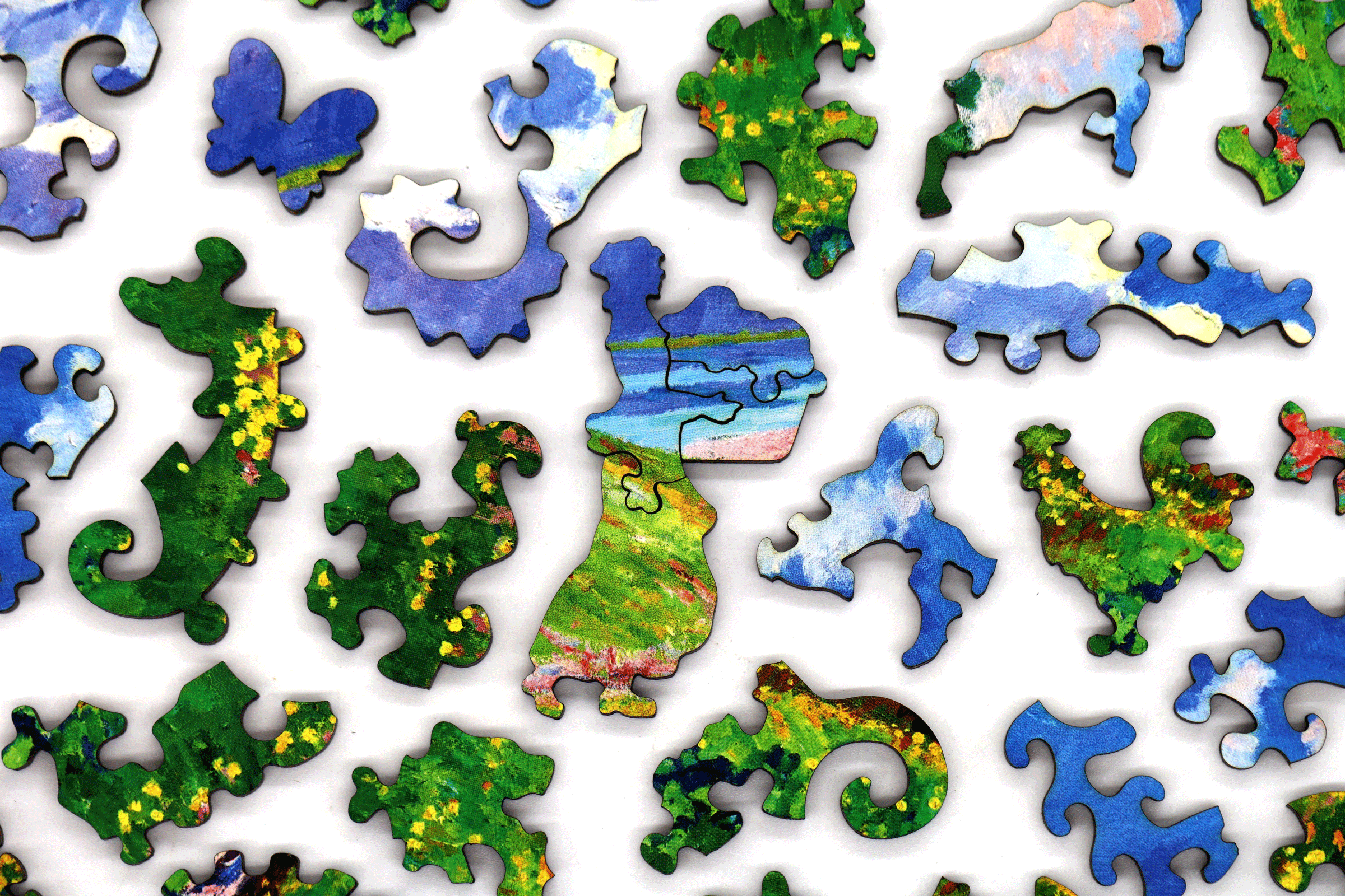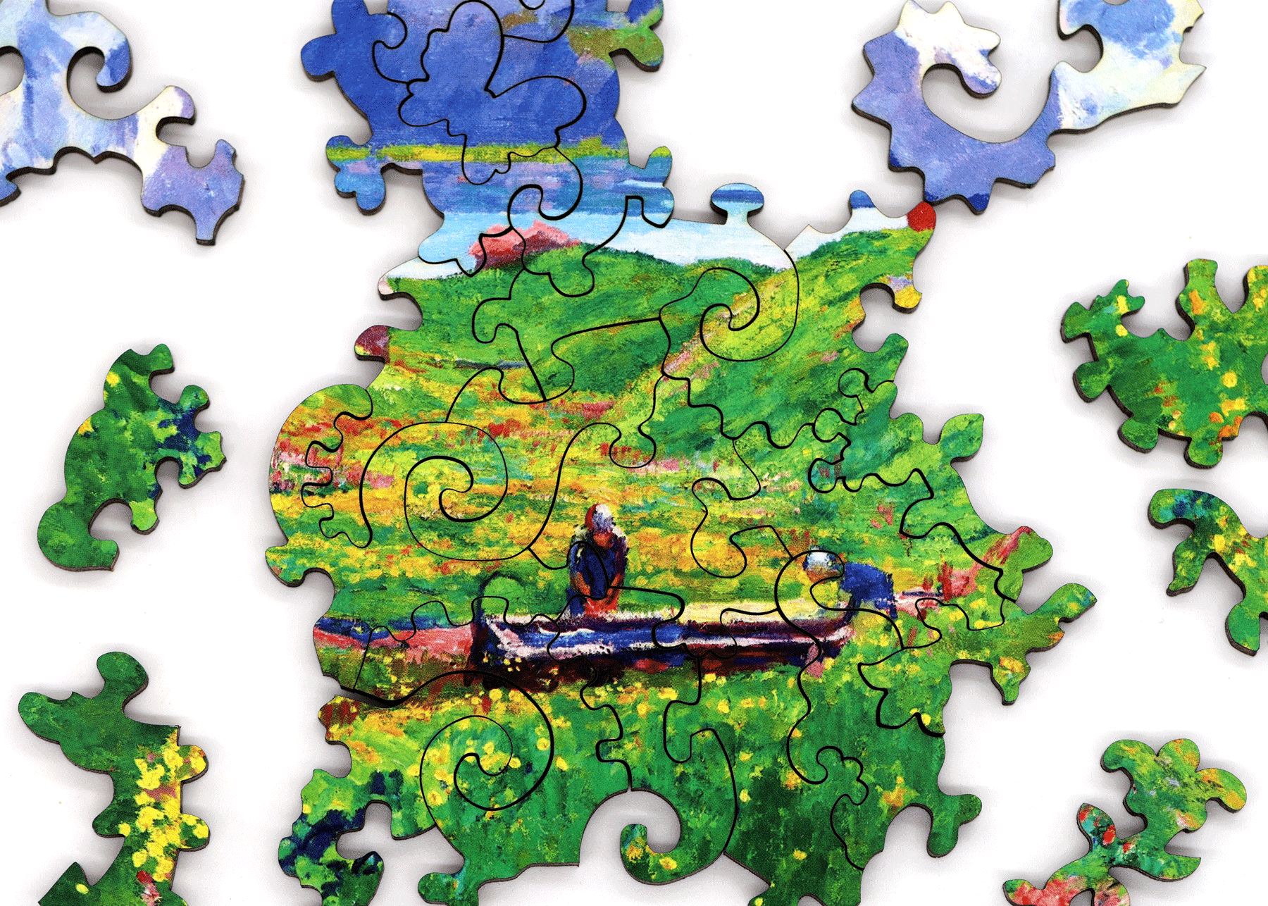A 147 piece wooden jigsaw puzzle is a springtime scene dappled with bits of color and sunshine, that feels like a warm, flower-scented breeze. Painted by Swiss Post-Impressionist Giovanni Giacometti.