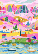 As you piece this puzzle together you'll notice cartwheels, cheerful birds and play of all sorts abound in the colorful embrace of the hills.