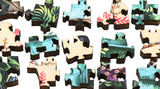The puzzle is average hard for our puzzles: it has a straight edge, square-ish pieces with diverse connectors, and robust animal whimsies  (some animals are one-piece whimsies, but some animals are hiding out as multi-piece whimsies that you might not spot at first!)