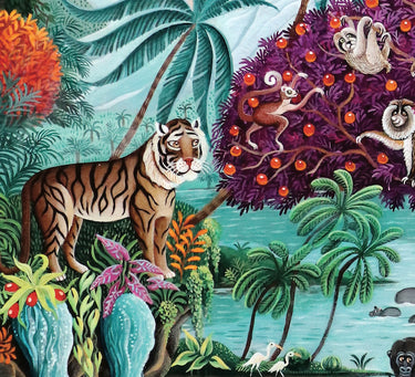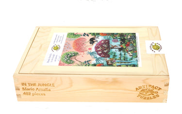 This wooden jigsaw puzzle has 402 pieces and is a highly-detailed, beautiful and colorful jungle scene by Marie Amalia.