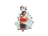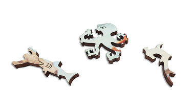 This is a 140 piece puzzle of "Octopus" by Paul Bond. The sneaky giant cephalopod in the art is paired with a clever puzzle design by Jef Bambas, which has an irregular edge, bubbly connectors, and many aquatic whimsies. Be warned this puzzle features man-eating sea-monster whimsies and so may not be suitable for all ages. The puzzle's difficulty is about average. NOTE: The irregular edge is not shown in the image on the box! Like all our puzzles, made with 1/4" thick wood and the pieces are laser-cut. Packaged in a blue box with a magnetic clasp. Made in USA.