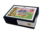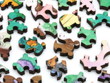 This average-difficulty puzzle has curvy pieces and diverse bubbly connectors, and lots of large multi-piece whimsies. The edge is a scalloped irregular edge as shown here. NOTE: The irregular edge is not shown in the image on the box!