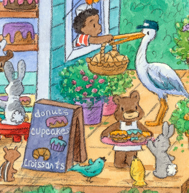 This 564 piece wooden jigsaw puzzle has a super cute image of a treehouse bakery by Amariah Rauscher.