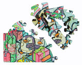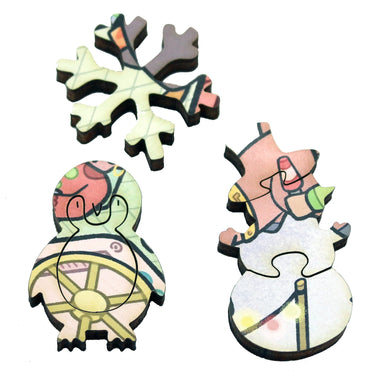 The puzzle has a straight edge, joyous winter-themed whimsy pieces, and a mix of connector shapes with some whimsical connectors. Puzzle design by David Figueiras.