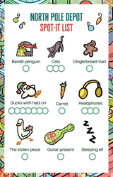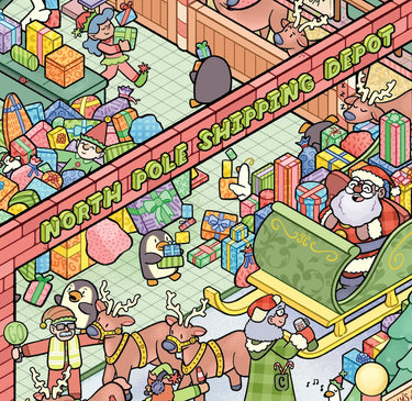 North Pole Depot is a busy, family-friendly look at the chaotic North Pole Shipping Depot at the height of Christmas prep. The elves are exhausted, and you might catch some of them napping! Luckily, the penguins have come up from the South Pole to help. We commissioned this artwork from Elijah Haswell in 2024.