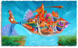 There is something fishy about this puzzle!! The fantastical image came straight from Tomasz Pietrzyk's playful imagination; apparently this colorful aquatic creature, complete with gills, fins, and spotting telescope will move your entire city. The puzzle designer, David Figueras, has had his fun, providing us with whimsey pieces in the shapes of moving men lifting their loads, various household goods, and, of course, lots of extra fish. We even learned some new puzzle terminology from this experience, as we now know what a "jittered edge" is; believe us, it is not a simple as a straight edge. We loved working on this puzzle, were captivated by the vivid colors, and it gave us two weeks of relaxed fun. Kudos to Rachel and Aaron who polished this off in one day!! (see previous review). Anyway, you can see that whether you are a slow puzzler or an expert speedy one, you will receive a goodly dose of joy in your day when you engage with the imagination of Tomasz Pietrzyk.