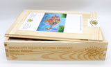 Like all our puzzles, laser-cut from 1/4" thick wood. Packaged in our standard pine wood box. Made in USA (specifically, in Port Townsend, Washington).