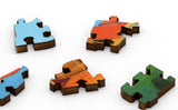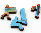 This wooden jigsaw puzzle has 518 pieces of a 2020 painting by Polish artist Tomasz Pietrzyk. It has a fun puzzle design by David Figueiras with lots of themed whimsies, diverse but simple connectors, and a jittered edge. It is average hard as our puzzles go for its size.