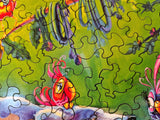 A roughly 500 piece wooden jigsaw puzzle inspired by the Jungle Story of Rudyard Kipling A drowsy bear lounges in his jungle home surrounded by feathered friends. Painted by Disney artist Denyse Klette.