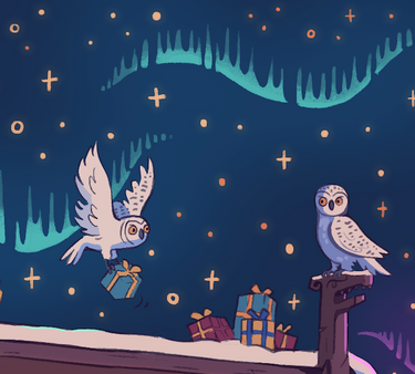 Sleigh Stop is a family-friendly scene of a cozy Nordic lodge where Santas stop for a break and to re-load, like a truck stop for Santas! Sleigh Stop is set in a beautiful forest with aurora borealis lights in the polar sky. There are many interesting Santas and elves and creatures in this highly-detailed image, with mild touches of humor suitable for all-ages. We commissioned this artwork from British illustrator Samuel Hayward in 2024.