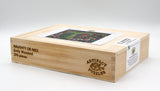 Packaged in a wood box with sliding lid, a small picture on top, and an engraved side label.