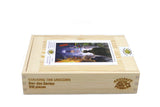 This is a 303 piece wooden jigsaw puzzle of the sci-fi / fantasy landscape titled Stalking the Unicorn, the cover image for the book with that title. Our puzzle pieces are themed to the artwork with a spattering of animal whimsy pieces and animal tracks by Jimmy Farmer. This puzzle has a straight edge and average difficulty. Like all our puzzles, the pieces are laser-cut and are 1/4 inch thick wood. Packaged in our standard pine wood box (sliding lid). Made in the USA.