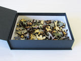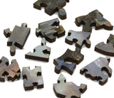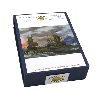 This 76 piece wooden jigsaw puzzle is a classic example of 17th century Dutch Baroque maritime painting by the master of the genre Abraham Storck, and shows whalers in the arctic fighting with polar bears. Click on the little pictures below the big picture to see example pieces - the puzzle features multi-piece marine mammal whimsies by Seattle artist Tara Flannery. This puzzle has a straight edge and average difficulty. All our puzzles are made with 1/4" wood. Packaged in a small box with magnetic clasp.