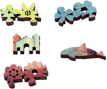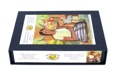 This wooden jigsaw puzzle has 245 pieces and shows-off the painting Maria Between Flowers by 20th century Mexican artist Alfredo Ramos Martínez with an elaborate decorative flowery irregular edge with drop-outs (that is, tiny pieces are left out of the edge pieces to make the edge look more flowery), that is not shown here nor on the box, to make it more surprising!