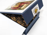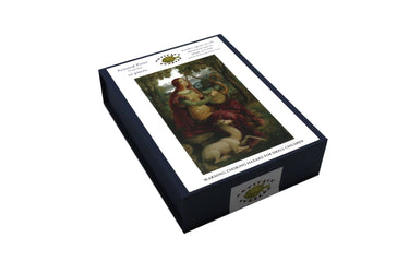 This is a 110 piece puzzle of Armand Point's 1898 "A Lady with a Unicorn." Don't let the young unicorn and red dress distract you from the beautiful scenery and swan harp. The design by Jef Bambas utilizes complicated interlocking pieces with delightful unicorn whimsies, occasional dropouts, and an irregular border to frame the art. NOTE: The irregular edge is not shown in the image on the box! The puzzle is a bit harder than average. Like all our puzzles, made with 1/4" thick wood and the pieces are laser-cut. Packaged in a small blue box with a magnetic clasp. Made in the USA.
