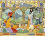 This is a captivating 337 piece puzzle of a 1915 illustration of the Arabian Nights story: Scheherazade is telling the Sultan a story in her marathon 1,001 nights of cliff-hanger-ing the Sultan each night so that he would spare her life in the morning to hear the rest of the story the next night.