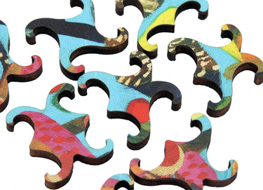This challenging 225 piece wooden jigsaw puzzle is really hard for its size because it has our unique split tendril connector pieces, just a couple of whimsies, and a decorative edge that arises naturally from the piece shapes so you can't sort out the edge pieces ahead of time. Puzzle design by Tara Flannery.