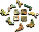 The unique puzzle design by Chandler Millwood is based on Japanese joinery, with pieces that lock together to form a frame, and some individual connectorless pieces that form windows onto the beautiful scene.
