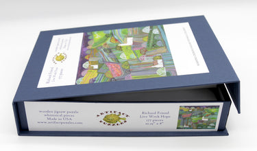 Like all our puzzles, laser-cut from 1/4" thick wood. Packaged in a blue box with magnetic clasp. Made in USA.