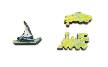 This puzzle is average hard for our puzzles. The puzzle design by Ashley Boyd and Chandler Millwood has a bunch of themed whimsy pieces, earlet connectors, staggered rectangular-ish pieces inspired by Van Gogh's brushstrokes, and a straight edge.