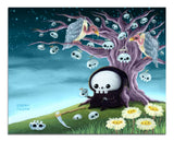 This dark and stormy 135 piece wooden jigsaw puzzle features the Little Grim Reaper sitting under the Skull Tree.