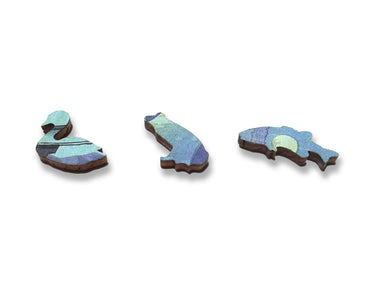 The puzzle design has an unusual Escher-esque puzzle design of interlocking fish piece shapes and an irregular edge, making this puzzle really hard for its piece count. Puzzle design by Jef Bambas.