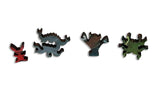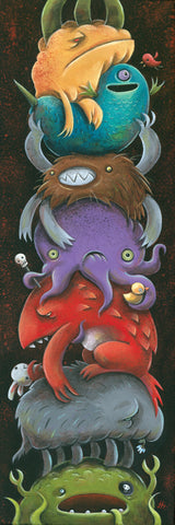 This is a 187 piece wooden jigsaw puzzle of a sympathetic totem of monsters, painted by Justin Hillgrove. Recommended for ages 12-and-up. The puzzle pieces were designed by Maria Berg, and are themed to this image. This puzzle has a straight edge and is easier than average. The puzzle is laser-cut from 1/4" wood, and made in the USA. Packaged in a cardboard box with magnetic clasp.