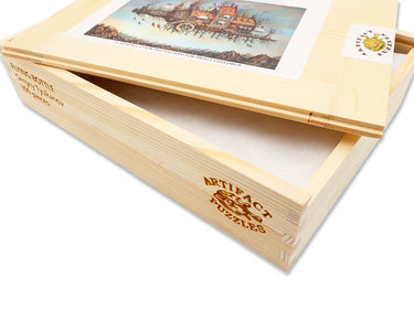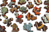 This 300 piece wooden jigsaw puzzle is a charming painting of an unusual flying machine by Russian neosurrealist Sergey Tyukanov. The pieces are connected with delightful cloud-shaped connectors and feature 15 themed whimsy pieces by silhouette artist Kathryn Flocken (click on the little picture above to see example pieces). This puzzle has a straight edge and average difficulty rating. Like all our puzzles, made with 1/4" thick wood in the USA. Packaged in a pine wood box.