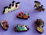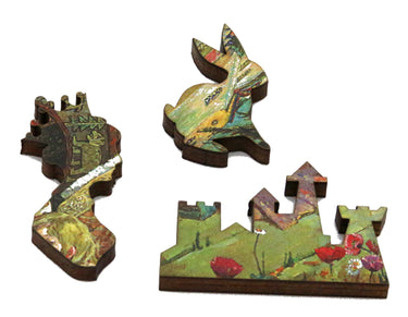This 137 piece puzzle shows a princess with all her entourage under a sleeping spell. The painting is by Russian painter Viktor Vasnetsov. The puzzle pieces are themed to match the puzzle (click on the small picture underneath the big picture to see example pieces), and were designed by Seattle artist Jimmy Farmer. This puzzle has a straight edge and is of about average difficulty. Laser-cut from 1/4" thick wood. Packaged in a small box with a magnetic clasp.