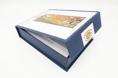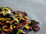 The puzzle pieces have extra exuberant swirly decorative piece shapes, designed by Seattle artist Tara Flannery and inspired by the style of the master hand-cutter John Stokes.