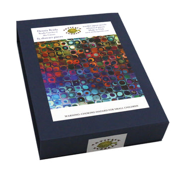 This is an incredible 65 piece wooden jigsaw puzzle of a digital artwork by Dennis Brady. The abstract sculptural pieces were designed by puzzle artist Tara Flannery in what we call Stokes-style, a tribute to the signature style of master hand-cutter John Stokes III (used with permission). This is a quick, fun puzzle- it takes most adults 20-60 minutes to put together, but is interesting enough to do many times. We laser-cut the pieces from 1/4" thick wood. The puzzle does not have any straight edge pieces, and measures about 11" x 11" when completed. NOTE: The irregular edge is not shown in the image on the box! The puzzle is packaged in a small box with a magnetic clasp. Made in USA.