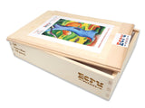 Like all our puzzles, made of 1/4" thick laser-cut wood and made in the USA. Packaged in our standard pine wood box.