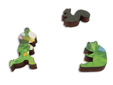 This is a 175 piece wooden jigsaw puzzle of an adorable painting by the artist-couple known as APAK. The puzzle has an oval-y edge and oval-shaped pieces and fun themed whimsy pieces; puzzle design by Maria Berg. The puzzle difficulty is average. Like all our puzzles, made with 1/4" thick wood and the pieces are laser-cut. Packaged in a small box with a magnetic clasp. Made in USA.