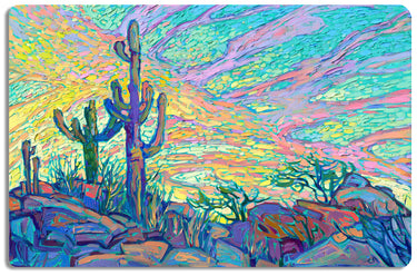 This is a 418 piece wooden jigsaw puzzle of "Dawning Saguaro" by contemporary impressionist painter Erin Hanson.